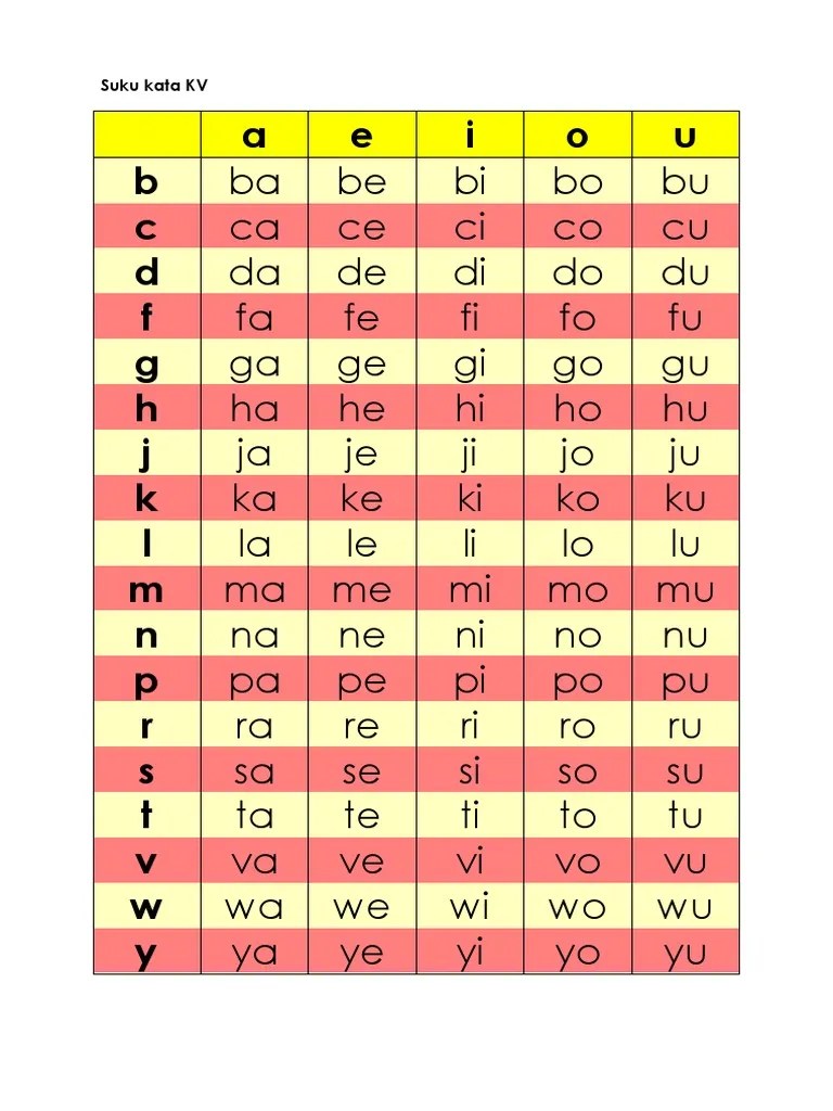 Mengeja dan membunyikan suku kata kv. Carta suku kata kv yang simple untuk murid tahap 1 ini saya kongsikan untuk sesiapa sahaja yang memerlukannya terutama para guru prasekolah,guru . Belajar membaca suku kata yayeyiyoyu #calistung . Huruf besar ab cde f ghi jk l Cikgu syikin huruf kecil abcdef gh i jk l mn o p q r s t u vwx yz. Aug 11, 2020 kata suku bahasa melayu tahun terbuka kv reading carta ba bu bi worksheets writing malaysia preschool activities kindergarten . Carta suku kata kv abc deutsch, vorschule, grundschule, lesen, oktober, alphabet. Kad carta suku kata kv ini saya perolehi daripada facebook group guru pemulihan khas malaysia. Untuk muat turun sila right click dan save . Cikgu hijau bbm kad carta suku kata kv suku kata kartu flash pemahaman membaca. Carta suku kata kv disediakan oleh: